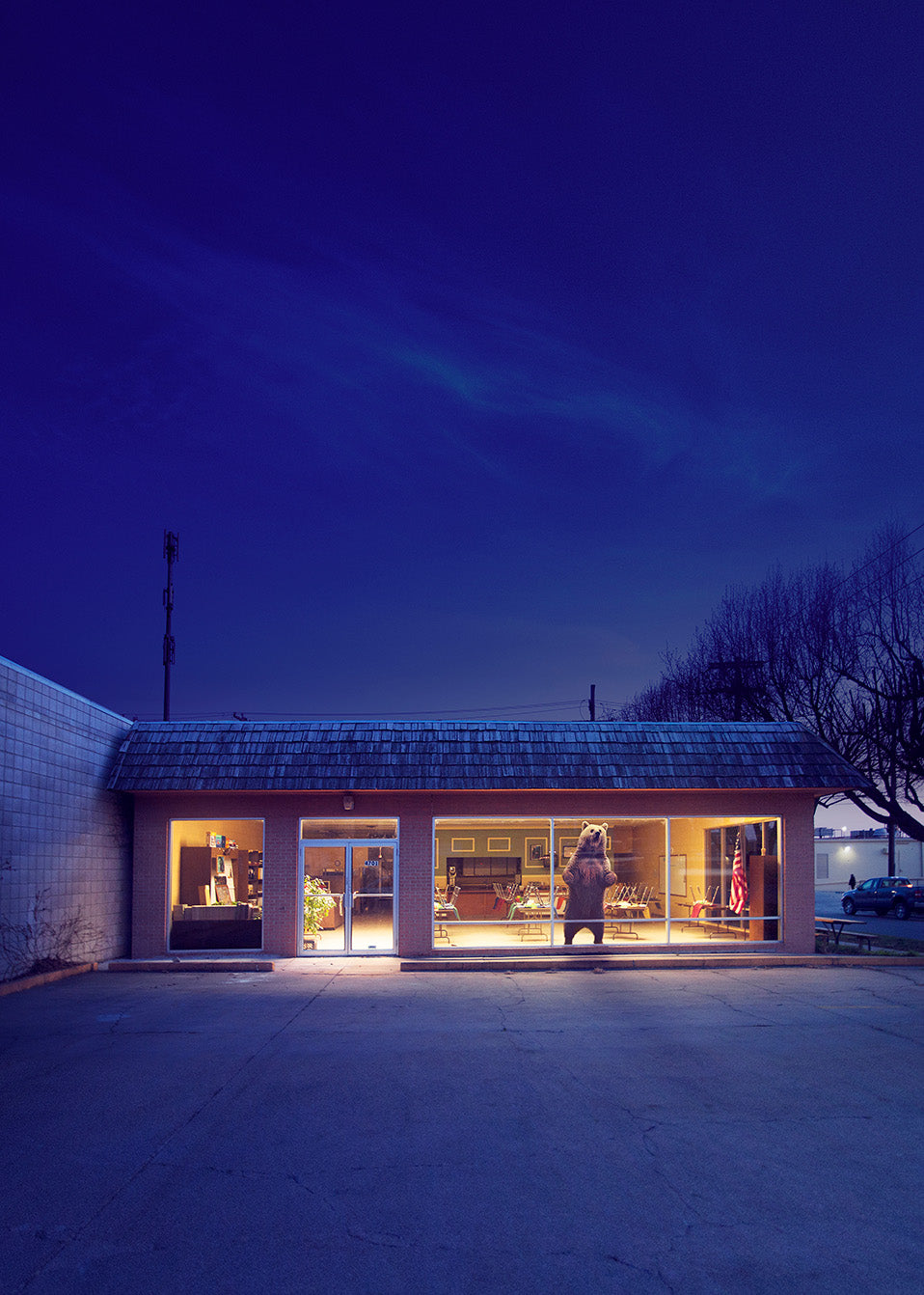 Inside, behind the glass, a bear statue looks into the night. Photographed 2006