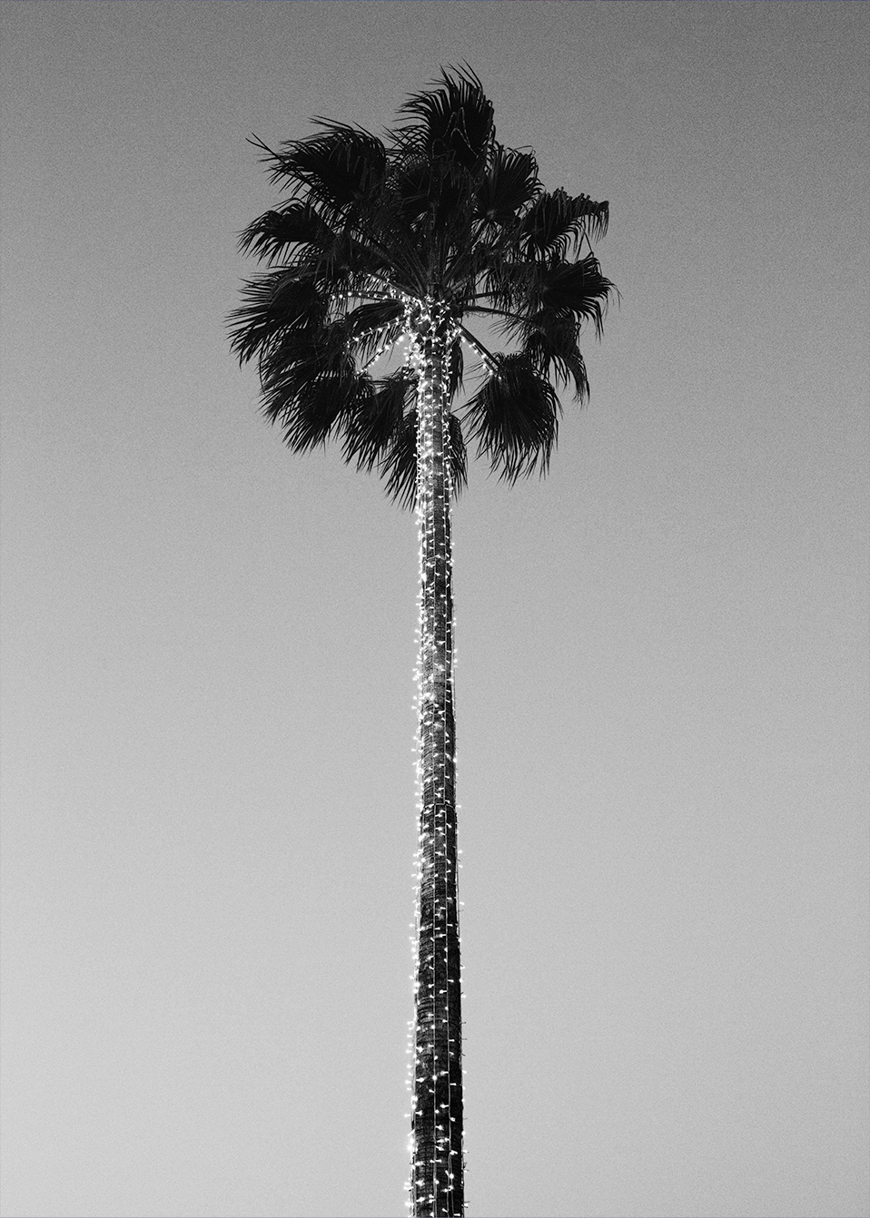 The silhouette is familiar — a classic beach-tree shape — trimmed with tiny lights.